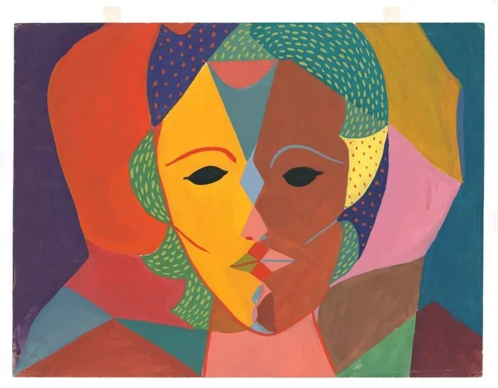 The geometric fragmentation of Triple-Face Portrait portrays Plath as an ambiguous puzzle. On one hand, the painted fragments “break up in pieces that fly about like clubs,” (from her poem Elm); on the other, they hold “colours cruelly locked in hexagonal hearts of ice” by “omnipotent white frosts.” Enshrined by the darkness of her own poetic descriptions, Plath’s Triple-Face Portrait creates a juxtaposing jigsaw of chaos, control, and calm. In this pair of portraits, Plath realises a “bleak and geometric tension,” trapping “the individual in the cell of her own limitations.” By applying tempera into the neat line-work of such segments, Plath can be seen concealing and revealing her own compulsive need to fulfill her ascribed societal roles, whilst grappling with opposing spiritual and internal worlds. Yet, the imperfect textures and riot of colour suggest an implicit vulnerability; perhaps that of her ‘inner child,’ reflecting with tentative hopefulness, the artist’s acknowledgement that she “must bridge the gap between adolescent glitter & mature glow” toward healing. Plath’s practically unattainable “desire to be many lives,” alluded to further in her fig tree metaphor – wherein all figs shrivel amidst overwhelmed indecision - is pictorially actulised via the separated blocks of colour of her self-portraits.