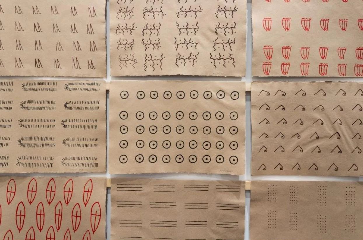 Sheroanawe Hakihiiwe, Kamie ya uriji pi jami Parawa ujame theperekui uriji ter- imi thepe komi kua (Where I live in my jungle and in the Orinoco river all these animals also live), 2018, Acrylic on 79 sheets of cane fibre paper, 35 x 51 cm each.