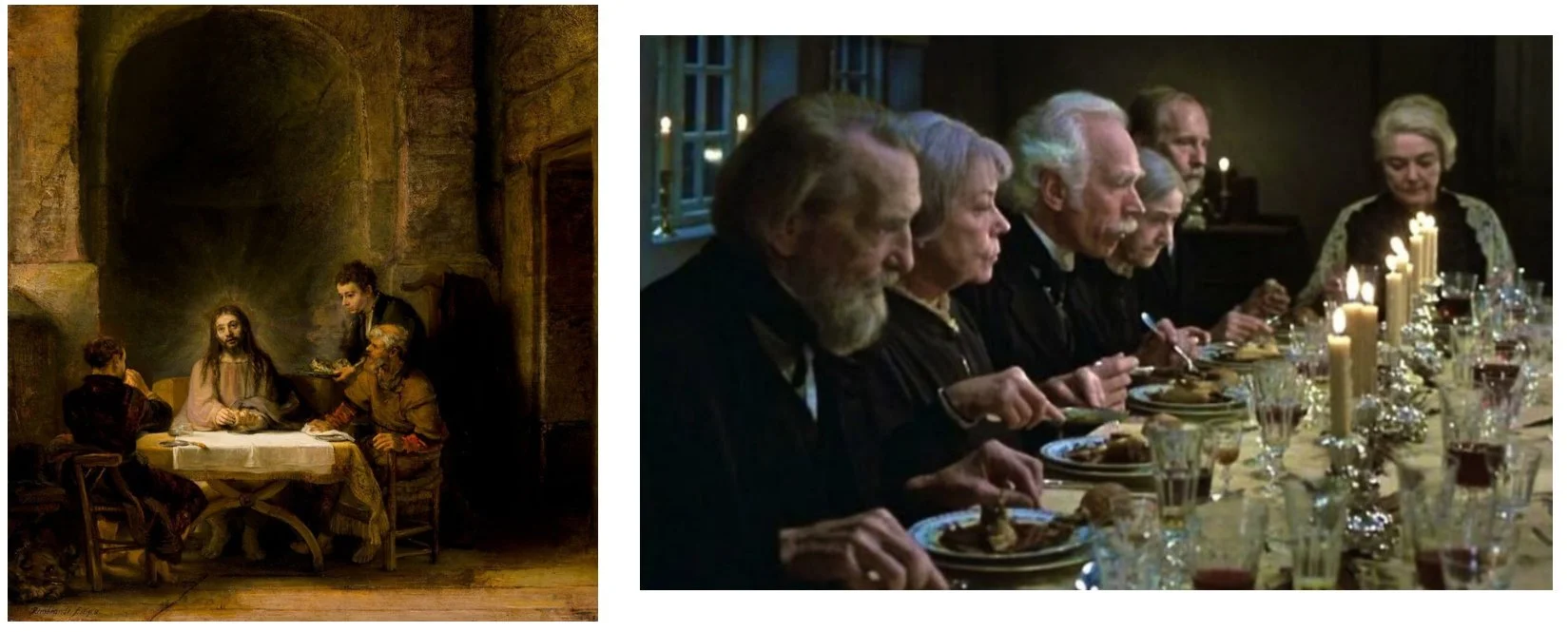 In Babette’s Feast, guests are gathered around the candle-lit table as faces emerge from darkness, golden light pooling on glass and silver. Both works utilise chiaroscuro and the composition around the table as moral stage. Moments of grace are rendered through light rather than action.
