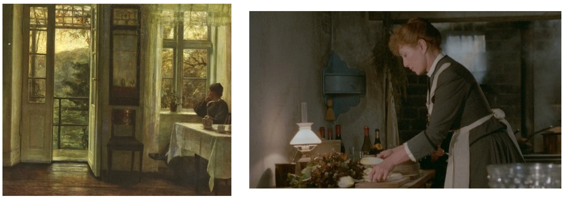 Left to right: Carl Holsøe, The Artist's Wife Sitting at a Window in a Sunlit Room, c. 1900. Babette in a small kitchen, working alone as light spills through the window onto table linens.