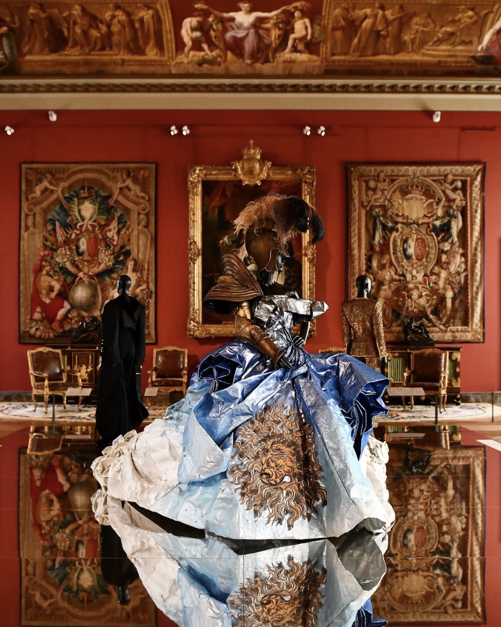 A silk ball gown designed by John Galliano for Dior in 2006 is located in the centre of a room dedicated to Louis XIV, beside gilded ornaments and portraits of the Sun King at the Louvre.