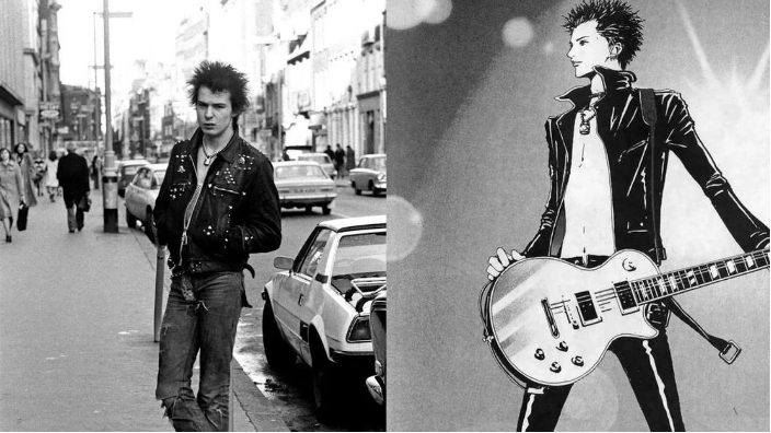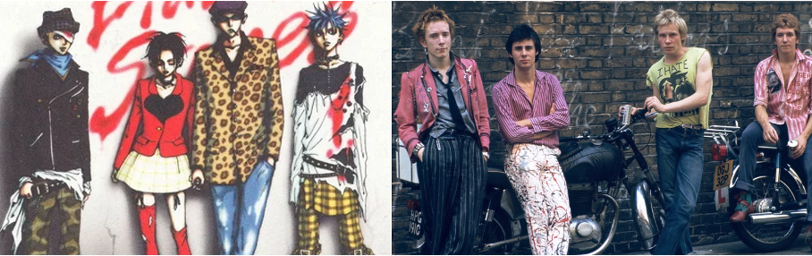 Ren Honjo, Nana’s boyfriend and former guitarist for the Black Stones before joining Trapnest, appears to be a direct homage to Sid Vicious, bassist of the Sex Pistols. Both Sid and Ren frequently wore a leather jacket and a padlock necklace, signature elements of Vivienne Westwood’s early designs. These motifs are particularly associated with the Seditionaries collection, which drew heavily on biker and fetish aesthetics. Ai Yazawa's portrayal of Sid Vicious as a manga character highlights the influence of the Sex Pistols, Vivienne Westwood, and the punk subculture in general on the series’ creation.