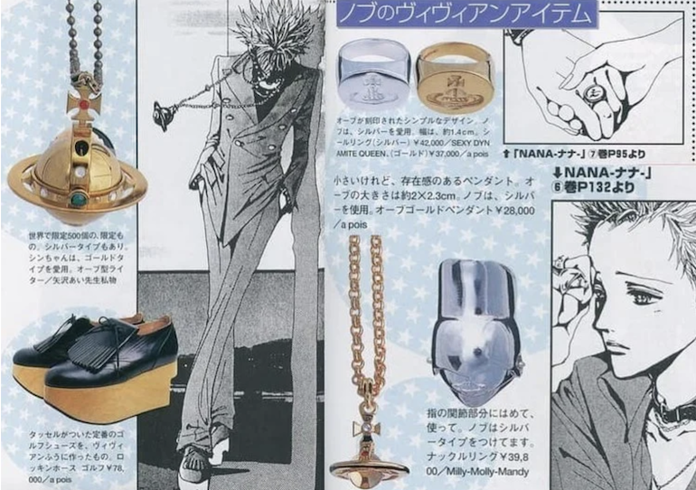 Vivienne Westwood’s accessories made just as strong an impression as the clothing. The image above shows a Japanese magazine product spread featuring items worn by Shinichi Okazaki in the series, including armour rings, ‘rocking horse’ platforms, and his signature limited-edition orb pendant lighter. By showcasing versatile designs that can be incorporated into a wide range of personal styles, this kind of promotional material connects the manga to real life, encouraging fans to purchase the same pieces the characters wear. In doing so, it highlights the power of visual media to shape aesthetic preferences and consumer behaviour.