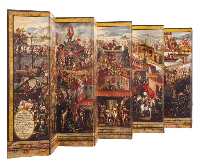 An illuminating case study is the dynamic Biombo de la Conquista de México y Vista de la Ciudad de México (seventeenth century), now widely known through Sotheby's. Comprising ten panels stretching over five meters, the screen paints two contrasting yet interrelated narratives: the violently saturated conquest of Tenochtitlan on one side, and a conversely empty, ordered cartographic view of colonial Mexico City on the other.