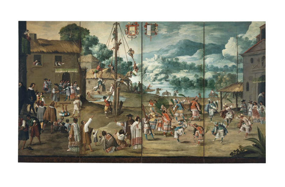 Unidentified artist, Folding Screen with Indian Wedding, Mitote, and Flying Pole (Biombo con desposorio indígena, mitote y palo volador), Mexico, c. 1660–1690, Oil on canvas, 167.6 × 304.8 cm.