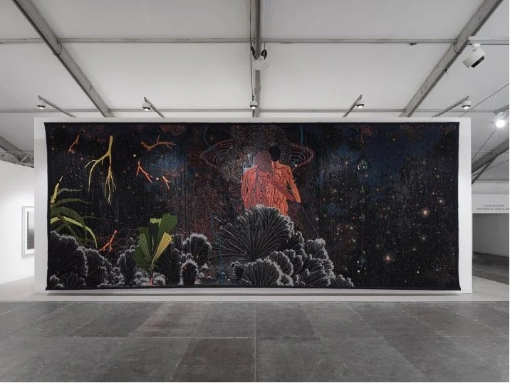 Some notable highlights of this year’s fair include Sophia Al-Maria’s, stand-up performance ‘Wall-Based Work’, which touched on a wide array of current themes including the assault on Gaza, and also commentary on the world of contemporary commercial art. Other notable works include a large collection of tapestry and textiles, including Grayson Perry’s impressive rainbow narrative tapestry ‘The Story of My Life’ at Victoria Miro Gallery, and Otobong Nkanga’s monumental intergalactic tapestry taking up an entire wall of Lisson Gallery’s booth.