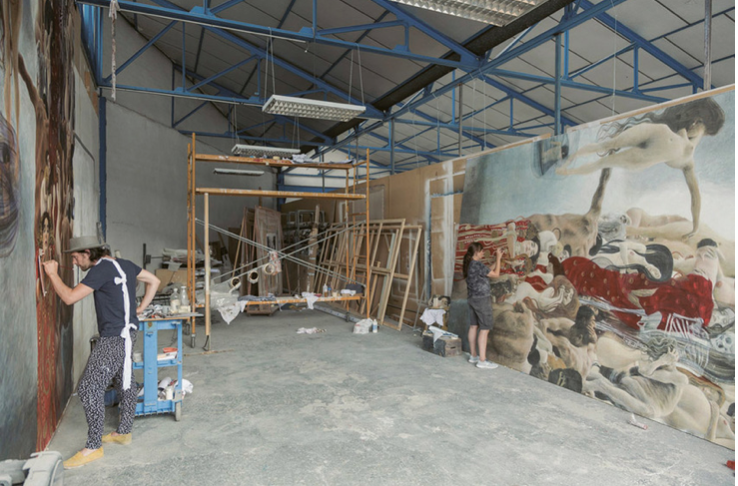 Fig. 2. Interior view of the large painting studio at Factum Arte’s headquarters in Madrid, where artists are working on the high-tech reconstruction of Gustav Klimt’s destroyed University of Vienna Faculty Paintings, Jurisprudence (left) and Medicine (right). Photograph © Copyright 2026 Factum Arte.
