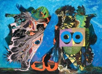 Many Surrealist artists, including René Magritte and Max Ernst, explored avian imagery in their art, something both Agar and Lucas did. Agar’s 1969 painting Pigeon Post is from a group of paintings she did of birds using vibrant and rich patterns. Many of these were shown at London’s Commonwealth Art Gallery in a 1971 retrospective. After briefly giving up painting during WWII she started again following several trips she made to Tenerife. The island’s light and tropical colours stimulated and enriched her imagination, which can be seen through her use of bold colours and patterns in Pigeon Post.