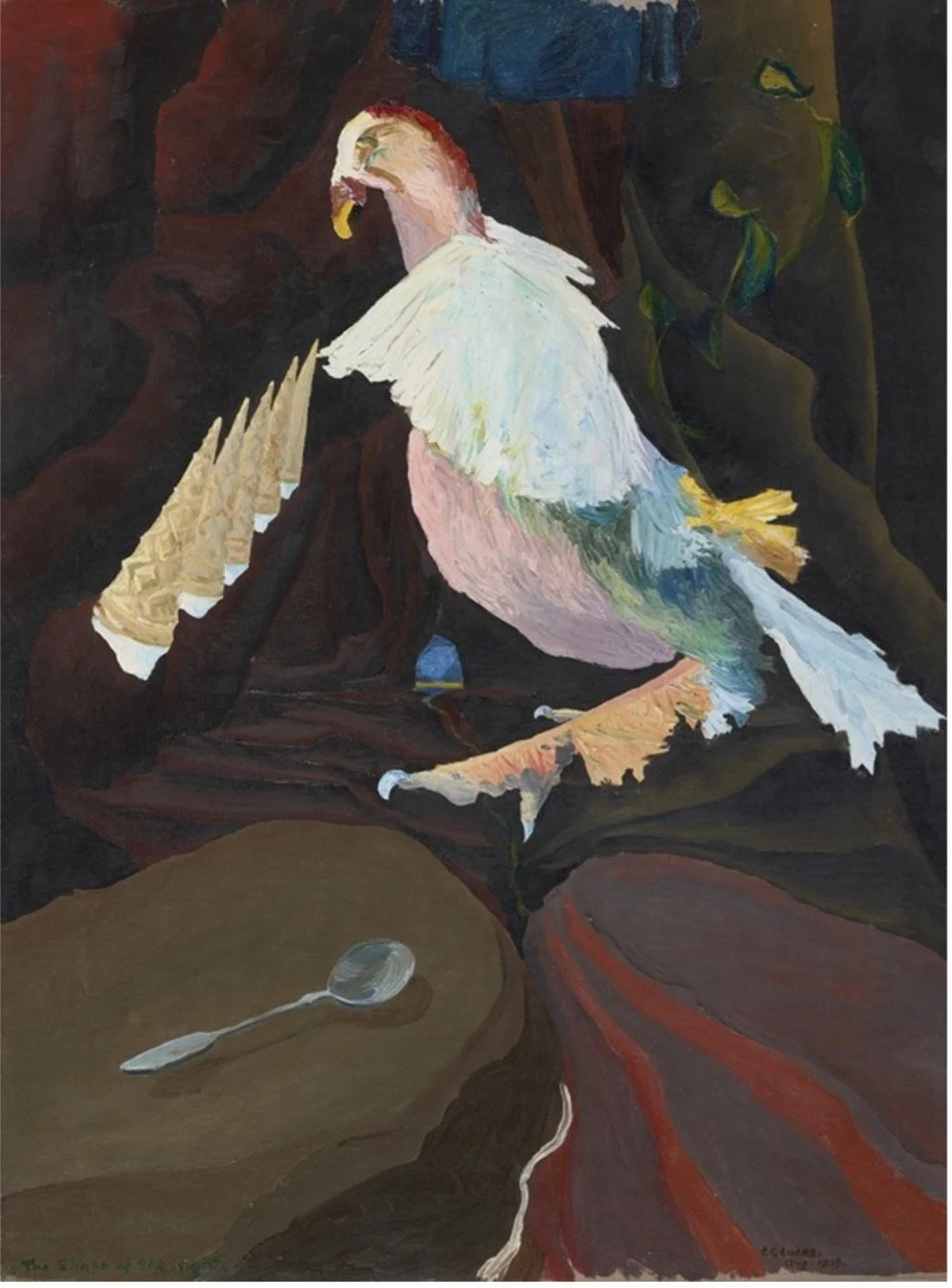 A different take on the bird is Lucas’s 1939 The Shape of the Night. As in Agar’s composition the bird is shown to the viewer from one side. Whereas Agar’s bird takes up most of the canvas, Lucas’ is depicted with other elements (a spoon and upside-down ice cream cones) and sits at a higher level within the composition. There appears to be some foliage emanating from behind the bird in the right-hand side of the painting and the viewer’s eye is led to the patch of blue in the centre of the painting which looks like an opening onto another world. This would be in line with the Surrealist belief that through our dreams we can gain access to another reality, one that lies beyond the one we know. The Surrealist emphasis on dreams is hinted at in the title, as they occur when one sleeps which is usually during the night. This may be what Lucas was taking inspiration from while painting this portal-like element. As noted by curator Patrick Ellis, the title resembles those of Magritte, but the work itself is entirely Lucas’s.