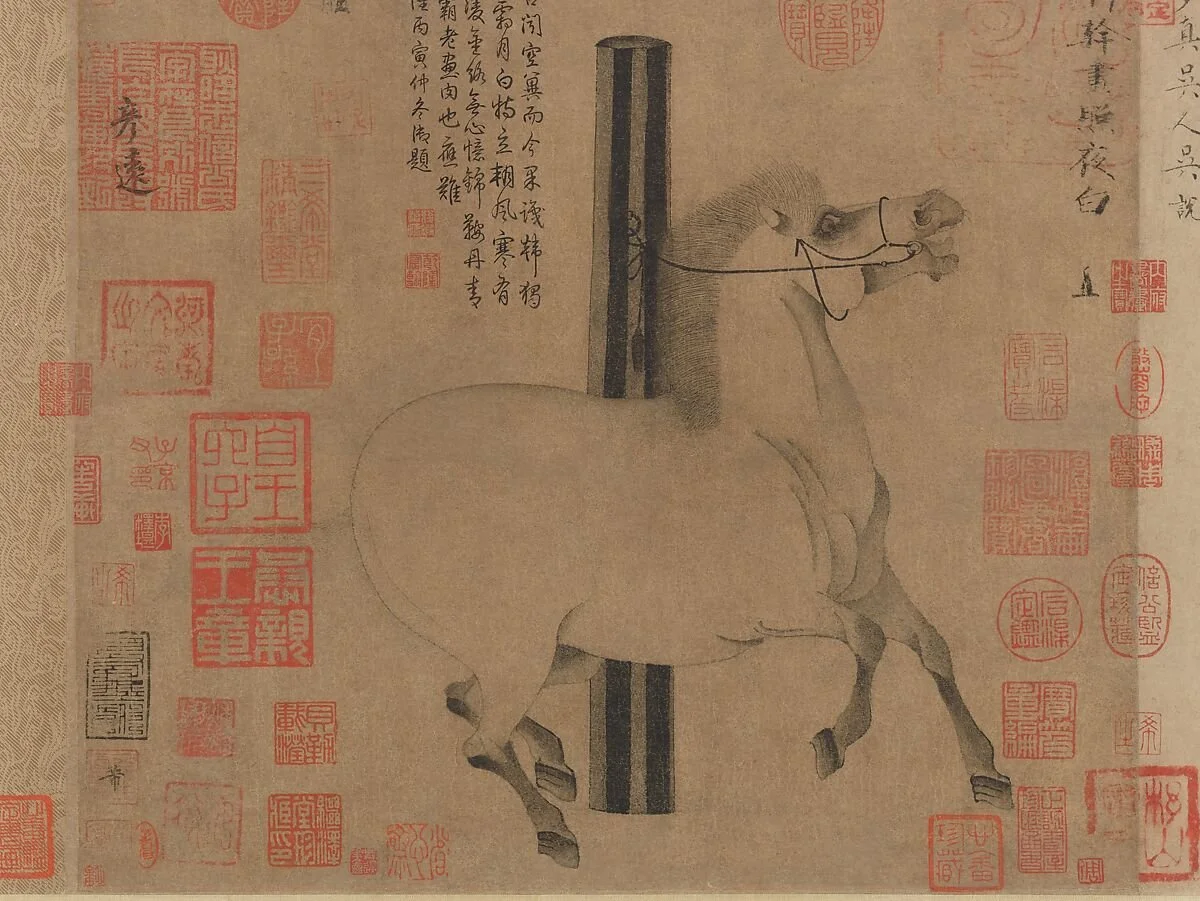 But the horse’s relationship with painting is older than Romanticism, older than the Renaissance, older even than the Christian tradition that would briefly forget it in favour of the lamb. The Chinese painted horses with a reverence approaching the sacred. Han Gan, the Tang Dynasty master, was said by the Emperor to have studied not from earlier paintings but from the imperial stables themselves – learning the animal’s inner spirit, its qi, the life-force that no copying of style could ever transmit. His Night-Shining White (ca. 750), a single horse on a scroll, neck arched in something between pride and wildness, eyes wide with a light that seems to come from inside, remains one of the most intimate portraits ever made of any living creature. The horse looks back at you as it has always looked back.