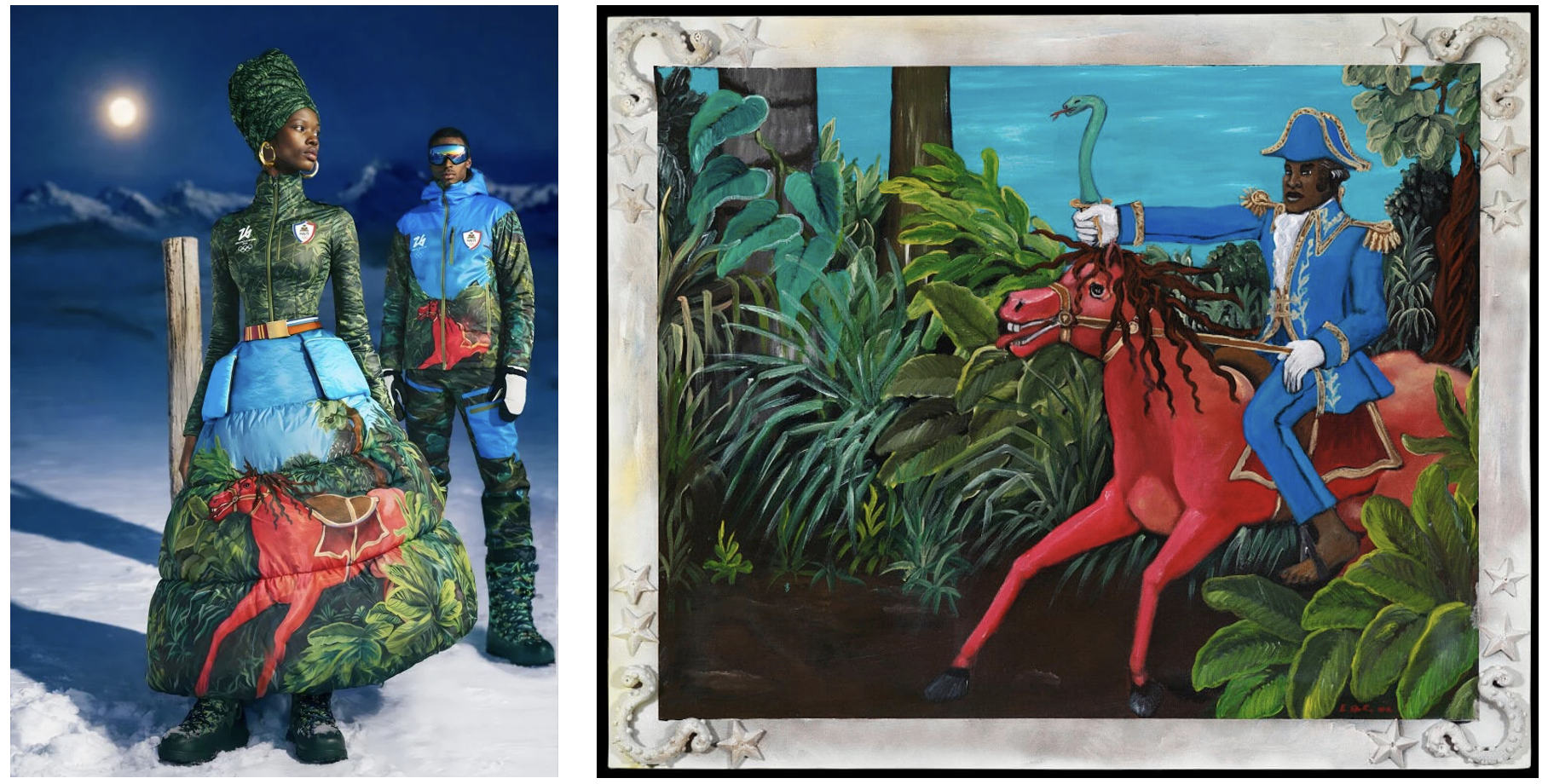 Left: Team Haiti’s uniforms for the 2026 Winter Olympics. Image credit Stella Jean.