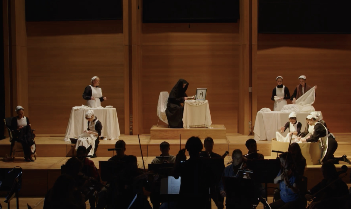 Originally premiering at the Metropolitan Opera in New York City in 1918 as the first part of Puccini’s Il Trittico, “Suor Angelica” is traditionally set in a seventeenth-century convent, where the titular character has been cloistered for seven years after giving birth to a child out of wedlock. In this updated production, director Orsolya Mollie Haynes, relocates the opera to one of the many Magdalen Laundries that operated throughout Ireland, Wales, and Scotland well into the late twentieth century. These institutions were ostensibly intended to rehabilitate so-called ‘fallen” women through forced domestic labor and religious rehabilitation, though, in reality, many women were subjected to systemic abuse, exploitation, and social erasure.