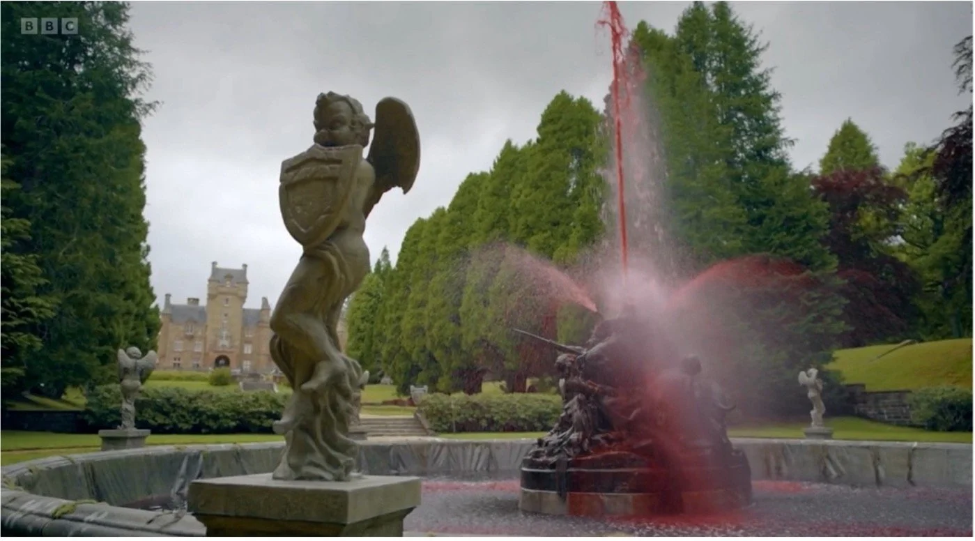 The symbolism extends outdoors. In one challenge of Series 4, Episode 7, the camera captures the castle’s ornamental fountain depicting The Boar Hunt. Crafted from Pelham stone and designed by the Bromsgrove Guild of Applied Art, it is a typical dramatic scene of the dangerous pursuit of a wild boar, symbolising courage, masculinity, and aristocratic sport. We are never far from the Scottish concept of the Braveheart. Yet, in this particular challenge, the fountain spills red ‘blood’, transforming an emblem of bravery into a chilling reminder of murdered faithfuls. Valour is drowned by betrayal.
