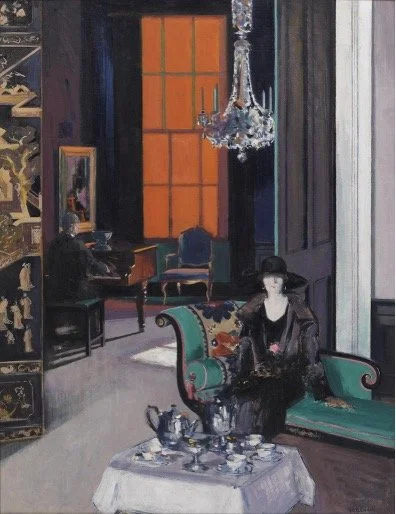In Interior - The Orange Blind, Cadell immediately establishes the tall, vivid orange blind as the dominant visual force within the composition. Its warm, saturated hue commands attention, enhanced by the surrounding dark, muted greys and blues, while the complementary teal of the chaise longue further enlivens the scene. The painting derives its impact from the boldness of these colours, functioning independently of narrative or decorative purpose. Cadell’s use of negative space draws the eye towards the female subject’s gaze, reinforcing her position as the central figure, while the male figure at the piano recedes almost imperceptibly into the background, second to the dominance of Cadell’s colour and composition.