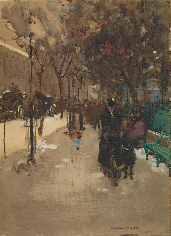 Arthur Melville, A Street Scene in Paris, a Wet Sunday Afternoon, 1889. Watercolour on paper, 48.80 cm x 37.20 cm. Scottish National Gallery of Modern Art. Image courtesy of Scottish National Galleries.